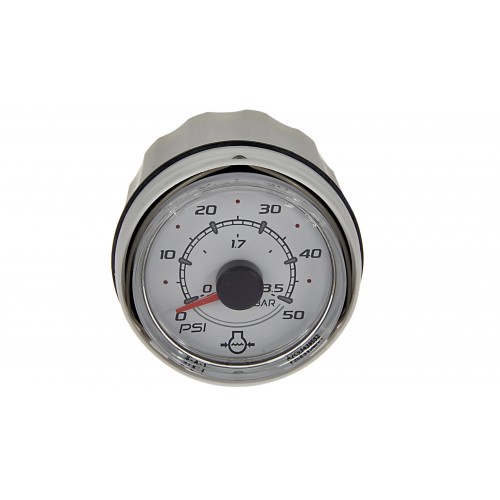8M0052871 (79-8M0052871) WATER PRESSUR,WHT for Mercury, Mercruiser, Force or Mariner - Mercury Marine 8M0052871 Water Pressure Gauge SmartCraft - Round - White. Round, white gauge face indicates the pressure of cooling water in your engine from 0-50 PSI. Fits in 2-1/8" (52mm) hole. Glass lens for durability and long service life. Application of this SC100 gauge will depend on the individual engine model and its sensors. Works with all SmartCraft compatible engines. Bezels are sold separately from each instrument allowing for the boater to select the color of their choice to compliment or contrast with the face of the instrument. Cooling water pressure gauge 8M0052871 works with all SmartCraft compatible engines. Round, white gauge face indicates the pressure of cooling water in your engine from 0-50 PSI. Fits in 2-1/8" (52mm) hole. Application of this gauge will depend on the individual engine model and its sensors. Bezels are sold separately from each instrument allowing for the boater to select the color of their choice to compliment or contrast with the face of the instrument. SC100 System Link gauges allow you to monitor vital engine and boat functions with digital accuracy. Furnished with a fog resistant lens, these gauges can be "daisy chain" interfaced between other SmartCraft products using a plug‑in connection. SC100 link gauges can be connected to a SC1000 System Tach, a MercMonitor or System Monitor.Mercury Marine’s passion for performance is matched by your drive for the new, the unknown. Our legendary reliability and durability let you boldly embrace your next adventure—large or small—knowing you’re backed by the best quality design, engineering, and materials.